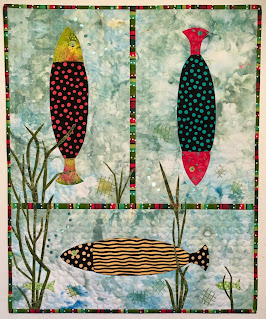 Hand-dyed and batik cottons, appliquéd raw edge motifs, machine quilted, faced edges, & hanging sleeve attached.